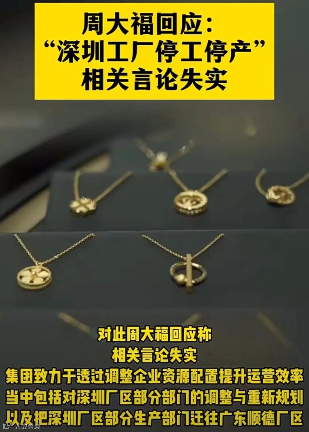 据网传通知截图,因市场环境变化,基于公司发展战略调整、业务生产转型需要,公司股东已决定将北山工厂的生产制造业务进行迁移及相关生产线、设备、原材料等资产转移。公司生产制造业务于2024年6月1日开始停工停产,停工停产期限及后续安排视市场环境和集团计划等情况确定,公司将另行通知。该通知落款为深圳市周大福珠宝制造有限公司。
