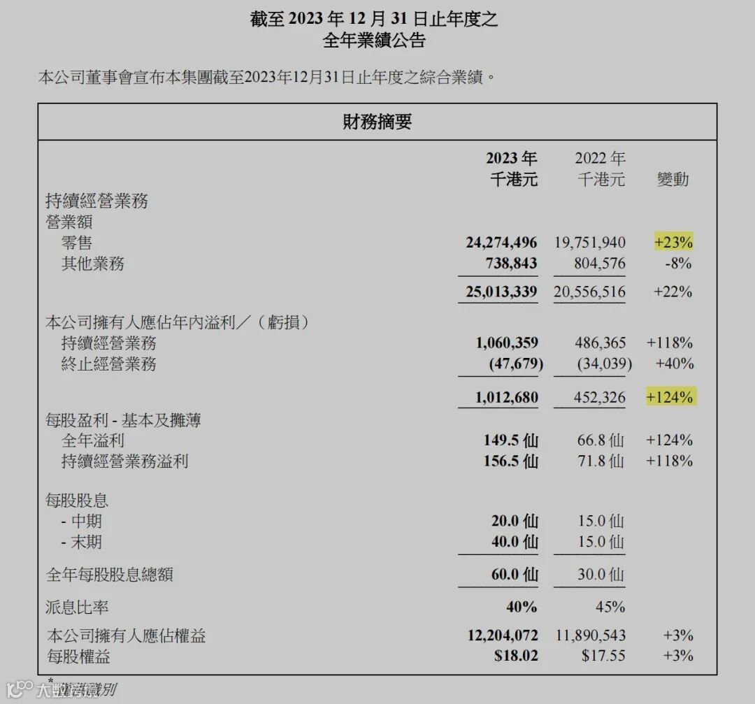 根据公告,周生生在2023年实现营业额达到250.13亿港元,较2022年的205.57亿港元增长22%。公司拥有人应占年内溢利由2022年的4.52亿港元增至10.13亿港元,增幅124%。每股盈利和每股股息也分别录得149.5仙和60.0仙。
