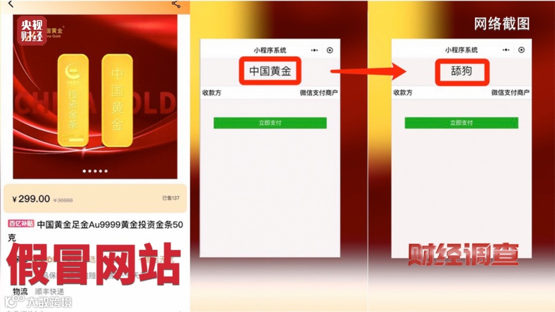 记者在一家深夜卖黄金金条的直播间看到支付页面最上方假冒的“中国黄金”四个大字,而到第二天假冒的“中国黄金”四个字竟然变成了“舔狗”,这个网络卖家就这样消失在了茫茫的互联网中。