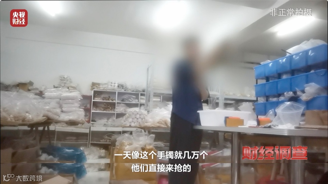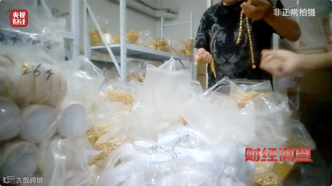 记者来到一家名为煜乾商贸有限公司,专门为直播间电商提供仿金饰品。在公司库房里,仿金饰品堆在货架上,吊坠、手链、手镯、戒指、项链、耳钉,品类繁多、应有尽有,满屋金灿灿让人眼花缭乱。