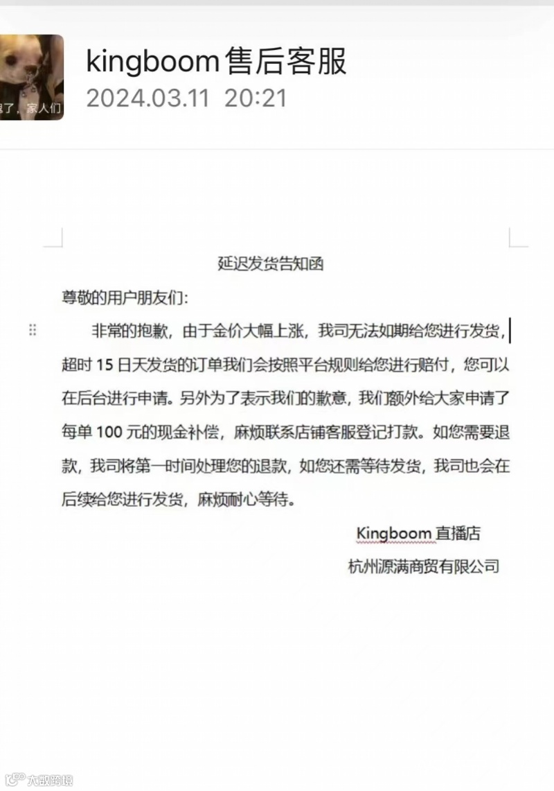 在经过消费者催促后,近日,Kingboom品牌给消费者发了一份延迟发货告知函,告知函中表示,“非常抱歉,由于金价大幅上涨,我司无法如期给您进行发货,超过15日天发货的订单我们会按照平台规则给您进行赔付,您可以在后台进行申请。另外为了表示我们的歉意,我们额外给大家申请了每单100元的现金补偿。”