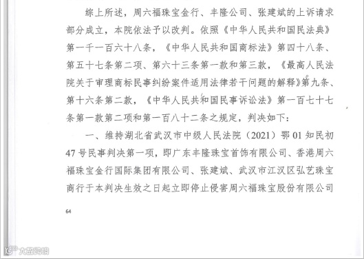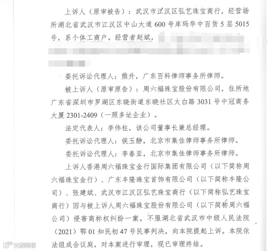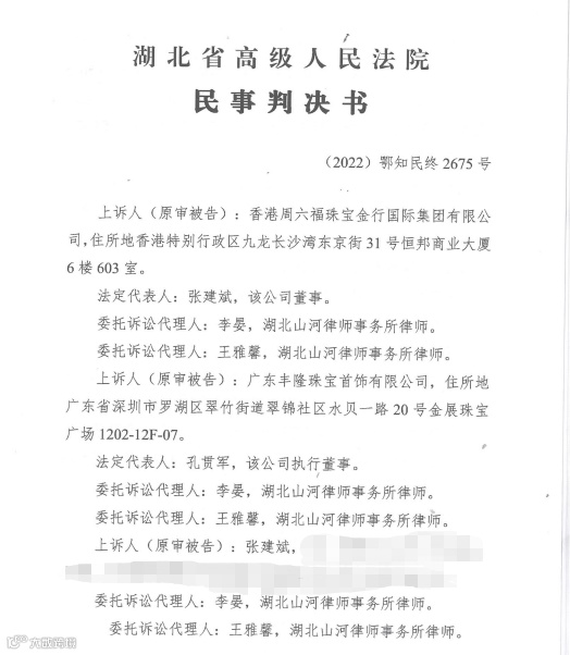 2023年8月22日,湖北省高级人民法院针对周六福珠宝股份有限公司与被告广东丰隆珠宝首饰有限公司、香港周六福珠宝金行国际集团有限公司、武汉市江汉区弘艺珠宝商行和张建斌之间的商标侵权纠纷一案作出二审判决,几被告被判决承担赔偿金额500万元。