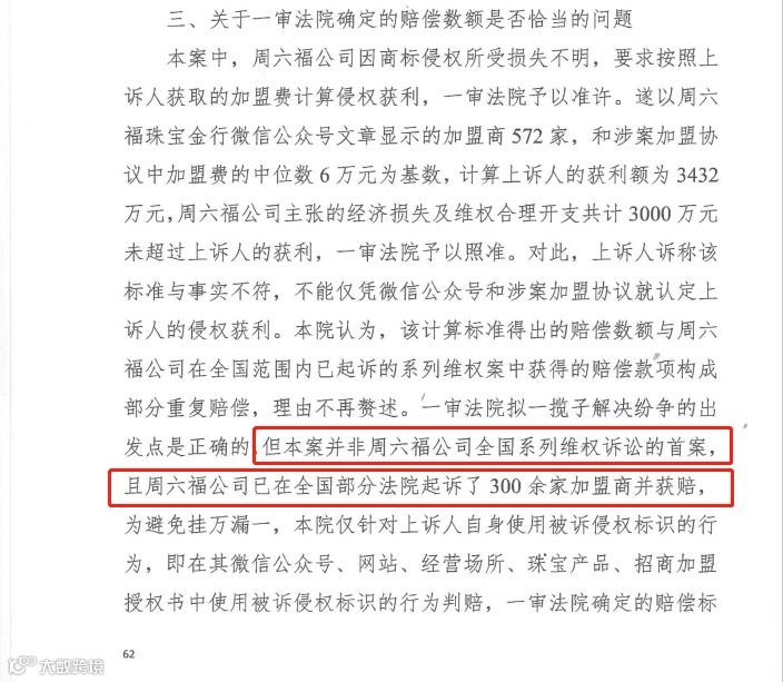 关于“香港周六福珠宝金行”商标违法之事,并不是第一次涉诉,这场周六福珠宝股份有限公司与香港周六福珠宝金行国际集团有限公司的民事诉讼案件持续多年,双方之间有多起诉讼争议,本案并非是周六福公司全国系列维权诉讼的首案,本案之前周六福珠宝股份有限公司已在全国各地法院起诉了被告的300 余家加盟商并获赔。
