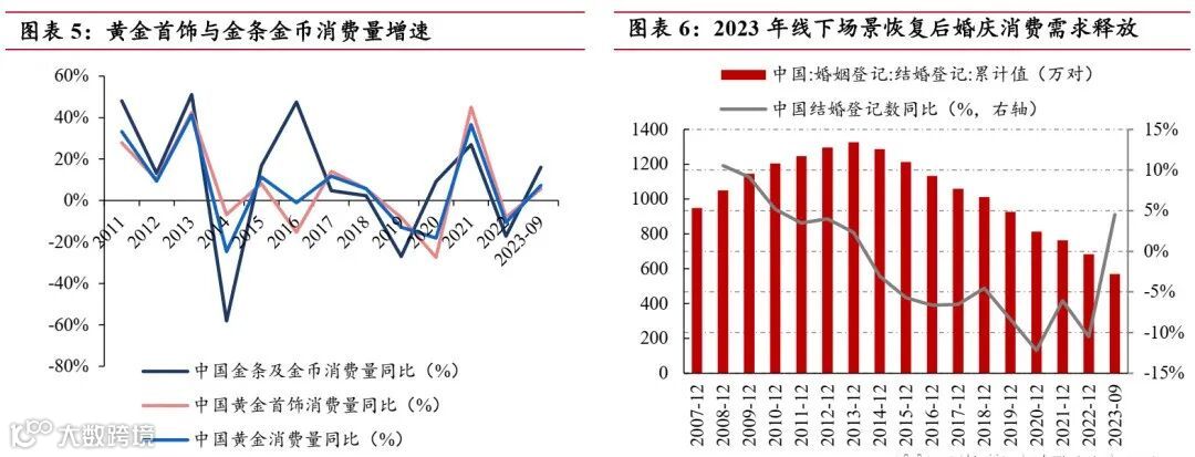 2)需求结构:消费需求长期维持在60%以上,消费需求可选属性较强,对金价的敏感度较低,主要受人均可支配收入、结婚人数等因素影响,整体表现平稳;投资需求以获取投资收益为目的,主要通过购买金条和金币等产品进行投资,对黄金价格的敏感度较高。伴随终端珠宝消费场景不断渗透,国内珠宝行业周期属性边际弱化、成长属性有望凸显。