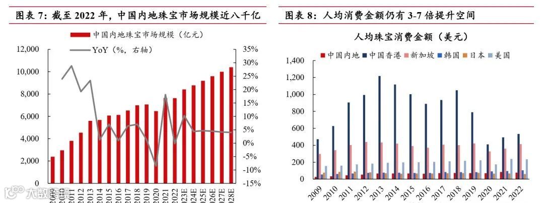 短期展望2024年,金价上行预期+黄金珠宝工艺升级驱动配饰等非婚庆场景需求+元旦春节假期行业迎来传统旺季,短期景气度有望延续。长期来看,相对美国/新加坡/中国香港等成熟市场,中国内地人均珠宝消费金额仍有3-7倍提升空间。未来伴随中国经济水平增长和国民可支配收入提升,以及黄金产品工艺升级下居民配饰需求提升趋势下,中国内地人均珠宝消费额仍有较大增长潜力。