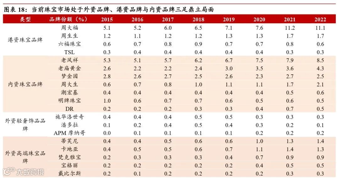 2)港资品牌:以周大福、周生生、六福珠宝、TSL等为代表,产品设计时尚,渠道覆盖主要集中在一、二线城市,近年来开始积极布局三、四线城市。3)内资品牌:以老凤祥、潮宏基、周大生等为代表,产品覆盖全面,渠道覆盖一线至四线城市,渠道拓展多采用加盟/经销模式。