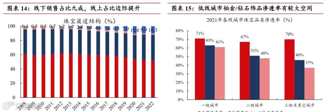 低线城市铂金/钻石饰品渗透率有较大提升空间。根据世界珠宝协会数据,2021年一线城市的黄金/铂金/钻石饰品渗透率分别为71%/63%/61%;二线城市分别为67%/51%/48%;三线城市分别为70%/46%/37%。低线城市的钻石和铂金饰品渗透率低,相比一线城市仍有较大提升空间,随着人均消费水平提升以及消费观念改变,低线城市的非金饰品渗透率有望提升。