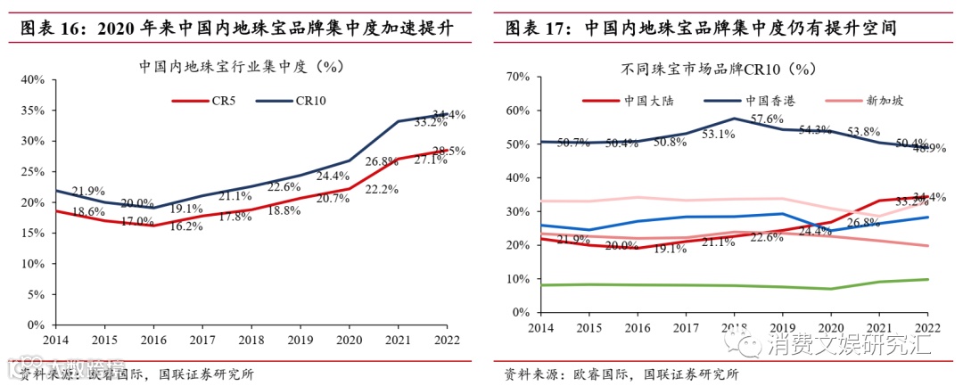 2)2020年以来行业集中度加速提升。港资与内资中高端品牌加快渠道下沉,逆势扩张,叠加外部不利因素加速尾部出清,珠宝行业集中度提升趋势加速,至2022年中国内地珠宝品牌CR10进一步由2020年的26.8%提升至34.4%。