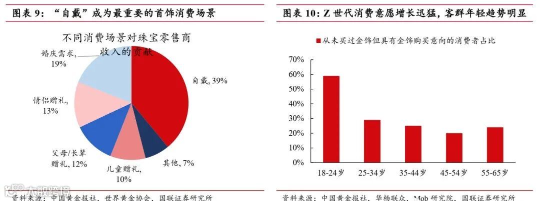 女性经济崛起,催生珠宝消费从婚嫁刚需向悦己消费转型。随着女性的经济实力提升和消费能力提高,女性在消费上拥有更多的话语权。女性自我犒赏、自我鼓励、自我装扮、自我表达的个性化需求,有望给珠宝产品消费市场的悦己消费场景带来进一步渗透。根据世界黄金协会调研数据,以“自戴”为目标的消费者为受访零售商贡献近40%的零售收入,而以往被认为首饰(以金饰为主)销售大头的婚庆需求则贡献近20%的销售额。