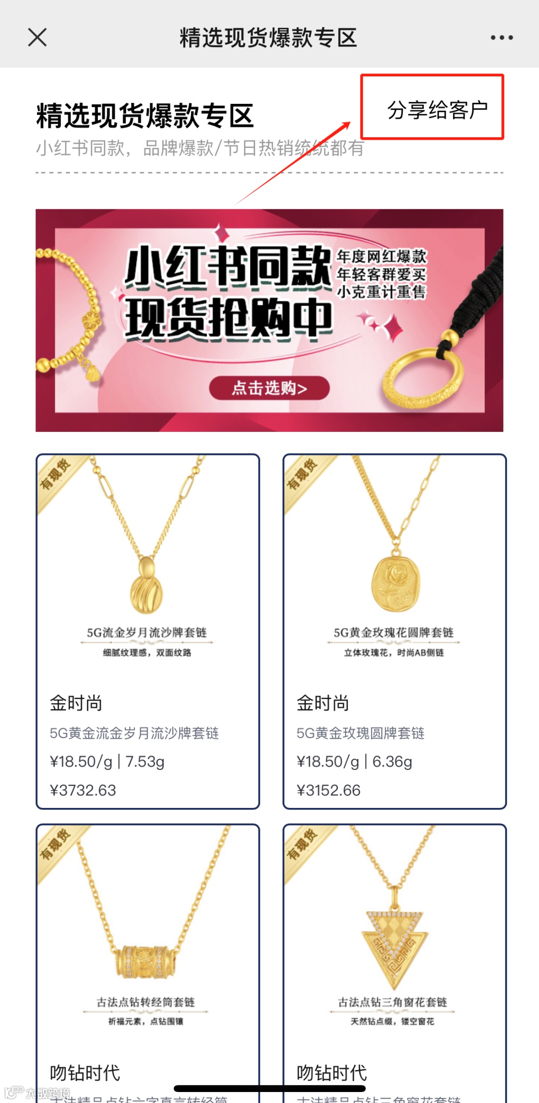 2.在微信中点开该链接,当前页面显示供应商、工费、大致价格等商品信息,点击右上角“分享给客户”,发送到目标客户或者社群;