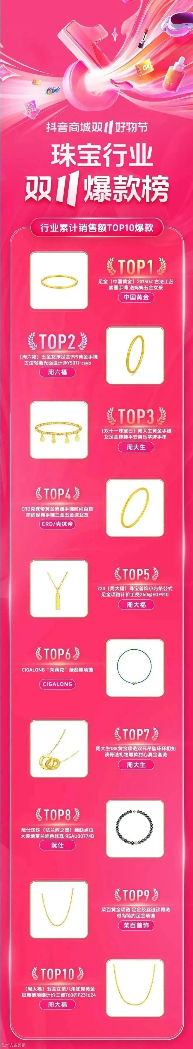 在现货专区的选品中,市场覆盖面积广、体量大是非常重要的标准。因此,双十一抖音黄金销售额top10的爆款中占据3席的古法素圈手镯、小红书50万+种草笔记的5G同款套链等极具消费热度的产品,都毫无疑问被选入了现货专区。