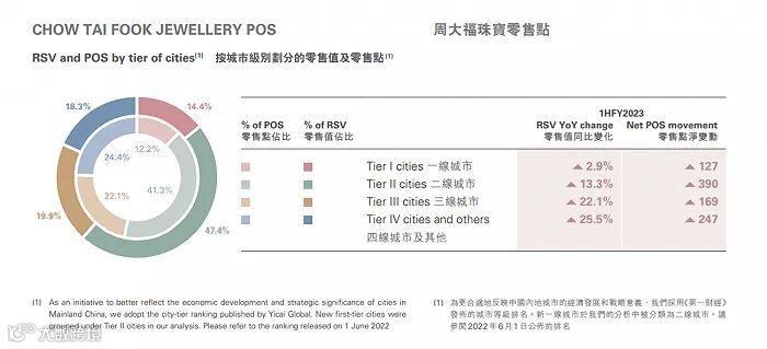 财报透露,预计于2023财政年度内(明年3月底之前),内地零售点数目达7000个。应当指出,下沉市场是周大福主攻目标之一。周大福表示,将联通加盟商深耕三线或以下城市和乡镇,开拓潜在市场。据财报披露,4-9月周大福在三线城市零售点新增169个,在四线城市及其他新增247个。相比之下一线城市仅127个,三四线城市扩张速度明显快于头部城市。