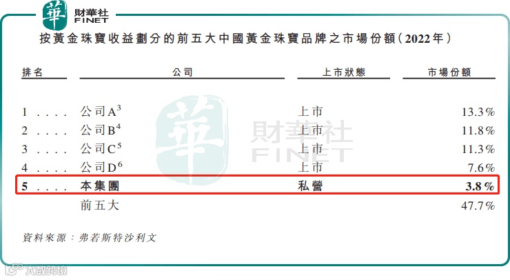 不过从市场竞争格局看,梦金园只能位列行业第二梯队。2022年,按黄金珠宝收益计,梦金园在中国黄金珠宝品牌市场中的份额仅为3.8%,名列第五名。排名前三的企业的市场份额则分别达13.3%、11.8%及11.3%。