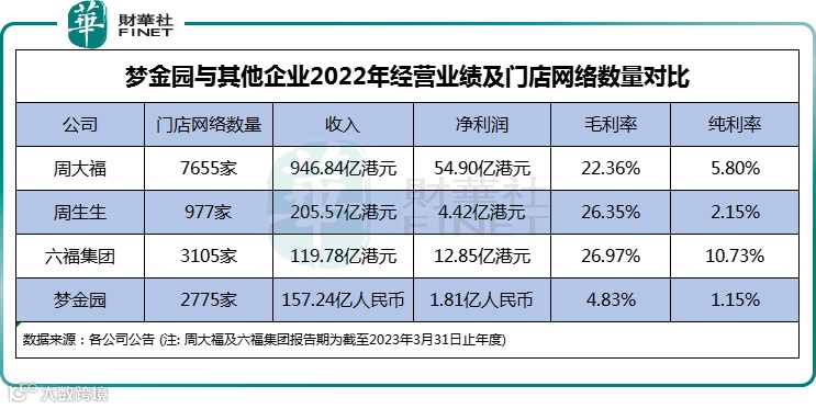与周大福、周生生及六福集团的经营业绩相比,梦金园的盈利能力显然较弱。2022年,周大福、周生生及六福集团的毛利率均超过22%,而梦金园4.83%的毛利率与之相比差距巨大。纯利率方面,周大福和六福集团的纯利率分别为5.80及10.73%,周生生为2.15%,也明显高于梦金园1.15%的纯利率。