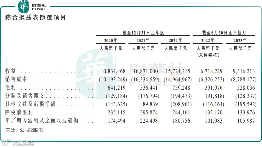 业绩方面,2020年、2021年、2022年和2023年上半年,梦金园营业收入分别为人民币108.34亿、168.71亿、157.24亿和93.16亿元,毛利分别为人民币6.41亿、5.36亿、7.59亿和5.28亿元,相应的净利润分别为人民币1.74亿、2.24亿、1.81亿和1.06亿元。销售的主要组成部分为黄金珠宝及其他黄金产品,占公司总收入的约94.1%、97.5%、97.9%及98.1%。