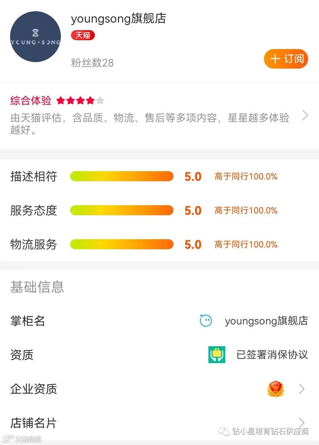在培育钻石线上第一战场——淘宝上,发现有一家名为YoungSong的淘宝天猫店,培育钻石产品看起来非常专业、全面。全5分的高分足以傲视同行。再进一步查询企业店铺的信息,显示是一家名叫深圳市金汇富投资实业有限公司,法人代表黄文婵。