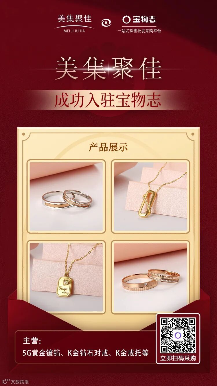美集聚佳主营5G黄金镶钻、K金钻石对戒等,是生产批发型企业。5G镶钻类产品将5G工艺与微镶工艺糅合,时尚优雅的设计美学深受年轻市场欢迎。公司拥有独立且成熟的生产研发团队,保证了供应链的可控性,不断提升产品质量。公司位于深圳水贝,采集并分析行业一手数据,可根据行情研判快速调整产品深度及广度,以帮助零售商家提高销售效率。
