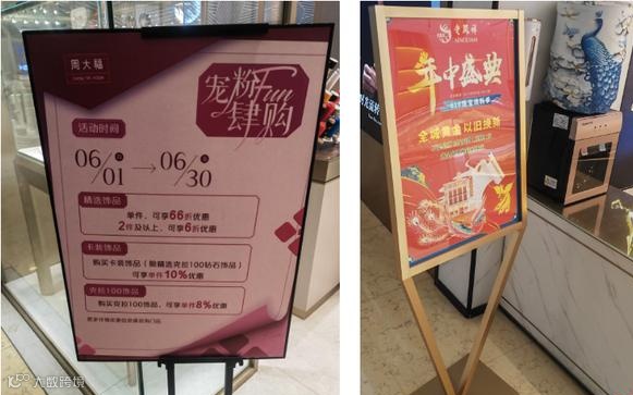 周大福在近一个月都在做饰品活动,折扣从6折到92折不等,老凤祥的年中盛典活动是黄金免费换等价钻石珠宝。周六福店内虽无明显活动标识,但记者详询产品后了解到,其钻饰几乎都有活动。普通钻戒活动折扣可到7折,一枚约为3万2千元的钻戒折扣价约为2万2千元,相当于降价1万左右。