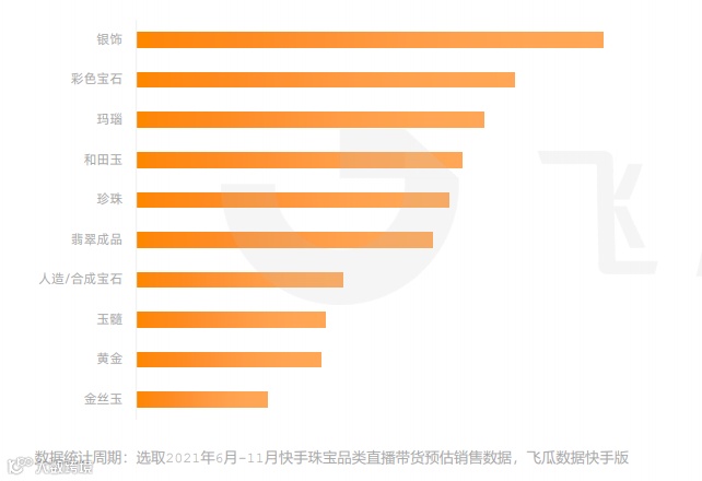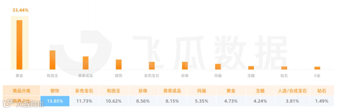 “黄金”作为直播间里高客单价的硬通货,无论是达人主播还是消费者,都集体掀起了一轮“黄金热”。据统计,2021年6月-11月间“黄金”以超 33% 的GMV占比成为珠宝品类中的佼佼者。同时“银饰”以物美价廉的优势,占领了低价市场。