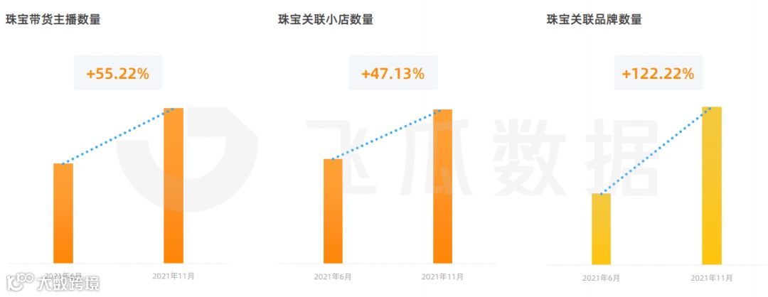 快手平台集聚了大量对珠宝玉石感兴趣的人群,无论是珠宝带货主播数量,还是珠宝关联小店数量,下半年都有所提升,特别是珠宝品牌的数量,增长率更是超过 100% ,更多线下品牌看到机会进入快手珠宝行业。