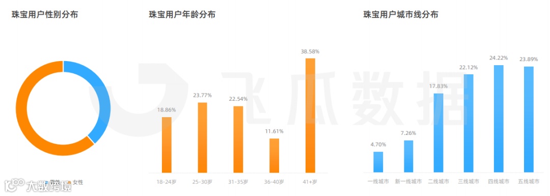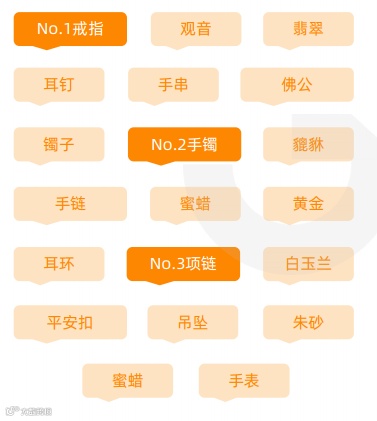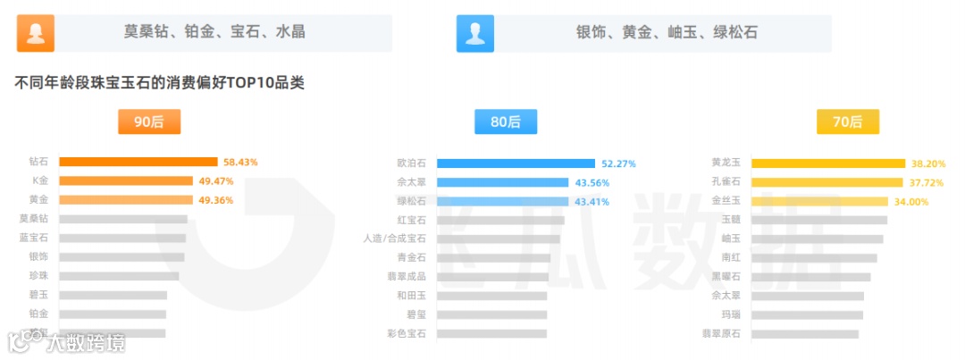 总体来看,不同性别、年龄消费品类偏好差异明显。男性长辈偏爱具有收藏价值的玉石,年轻女性热衷购买K金、钻石等首饰。