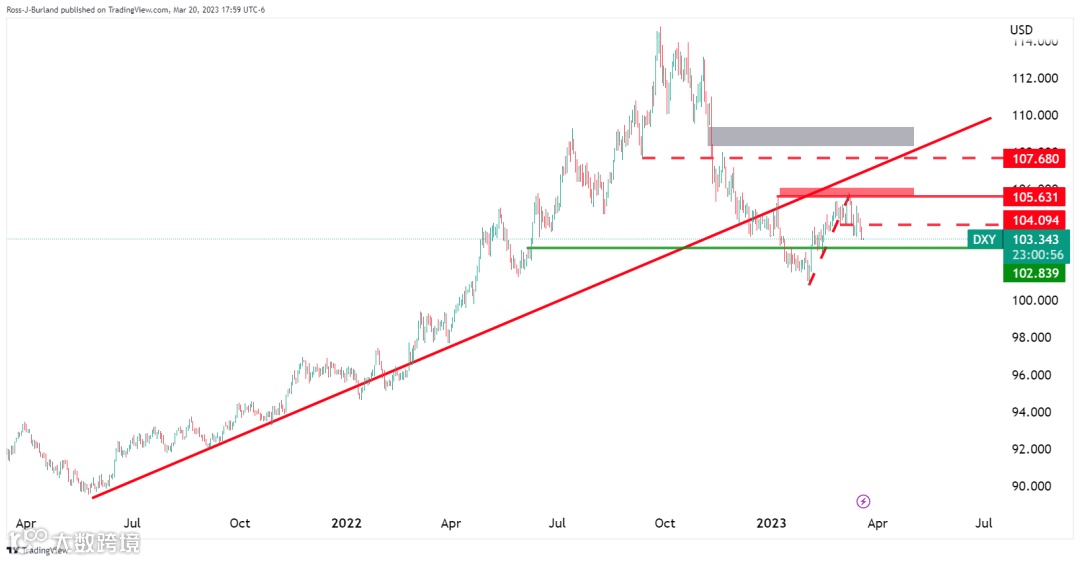 美元指数触及2月15日以来的最低水平103.27,然而美国地区性银行仍存在担忧。第一共和银行(First Republic Bank)股价周一暴跌50%,最新下跌约39%。此外,加拿大银行、 英格兰银行、日本银行、欧洲中央银行、美联储和瑞士国家银行正在采取协调行动,通过常设美元流动性互换额度安排来加强流动性供应。