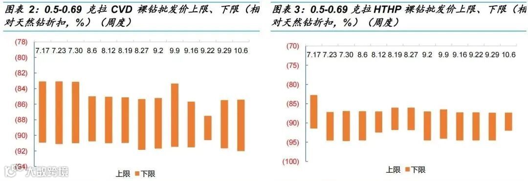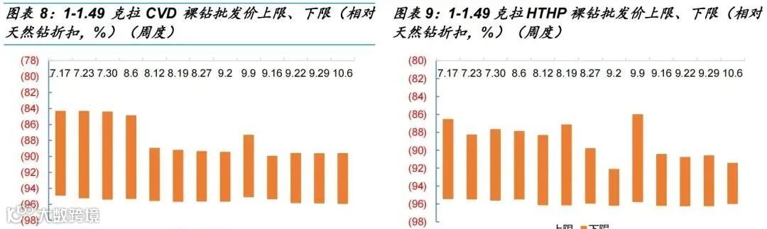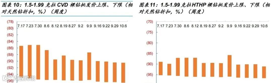 CVD 0.5-0.89克拉总体持平,个别品级有回升/下滑;0.9-0.99克拉F色下滑20%,其他品级持平;1-1.49克拉E/F色下滑10%+,H色回升个位数;1.5-1.99克拉G/H色下滑10%、其他品级持平。