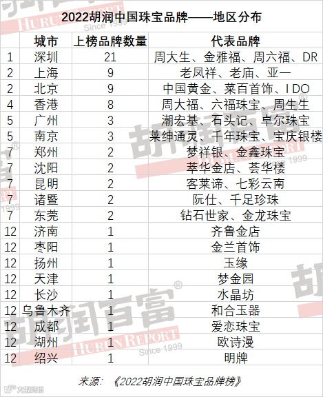 此次榜单,深圳上榜珠宝品牌最多,共21个;上海和北京并列第二,各9个;香港第四,有8个。胡润百富董事长兼首席调研官胡润对此表示,“在上榜珠宝品牌最多的城市排名中,深圳绝对第一,远超排在其后的上海和北京。可能很多人都不知道深圳,特别是罗湖区的水贝珠宝交易中心,对本土珠宝品牌的影响这么大。”