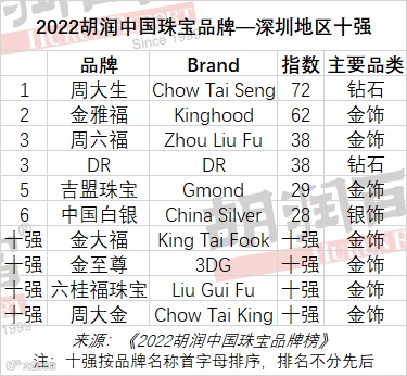此外,记者注意到,前十名中香港品牌最多,有3个;上海、北京和深圳各2个。深圳这两家分别是周大生和金雅福,周大生2020年营业收入突破50亿元,截至2020年底,线下门店数量近4200家,其中加盟店3900多家,自营店近250家,周大生是深圳第一家荣获驰名商标和中国名牌的珠宝企业;金雅福2020年营业收入超过400亿元,独创的黄金珠宝3D打印技术曾获2021中国珠宝玉石首饰行业协会科学技术奖。