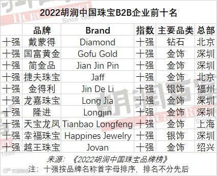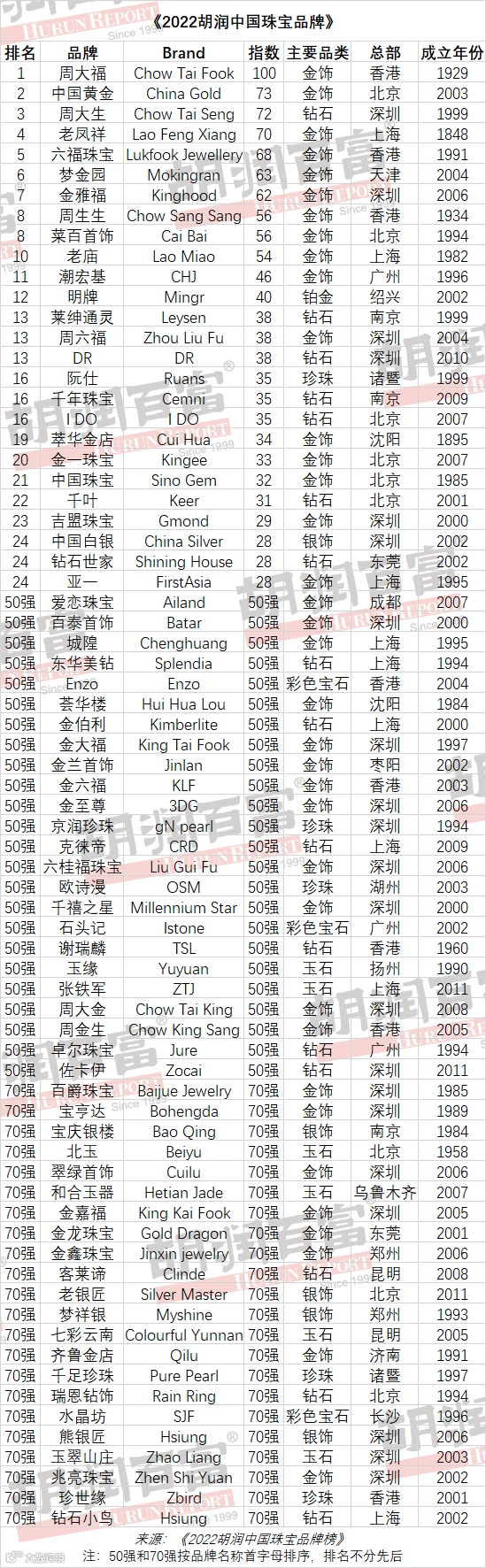 1月18日,胡润研究院发布《2022胡润中国珠宝品牌榜》,列出了前70名中国珠宝品牌和前18名中国珠宝B2B企业。这是胡润研究院第一次发布中国珠宝品牌榜。
