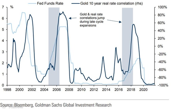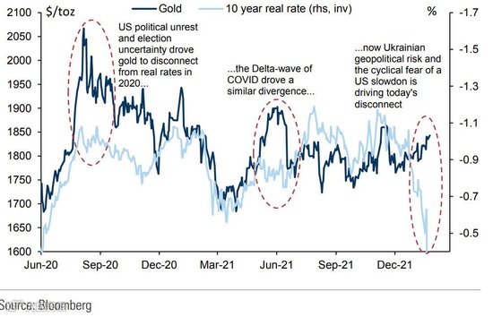 Currie指出,随着地区紧张局势的加剧,黄金显然会是最后的货币。虽然黄金在2022年潜在的利空因素将是美联储即将加息以及长期实际利率上涨的可能,但高盛发现,从历史上看,当黄金与长期实际利率的负相关性也趋于破裂时,黄金往往会在加息时期上涨。这种情况已正在发生,在美国10年期实际利率近期上涨的同时,黄金表现出较大的弹性。