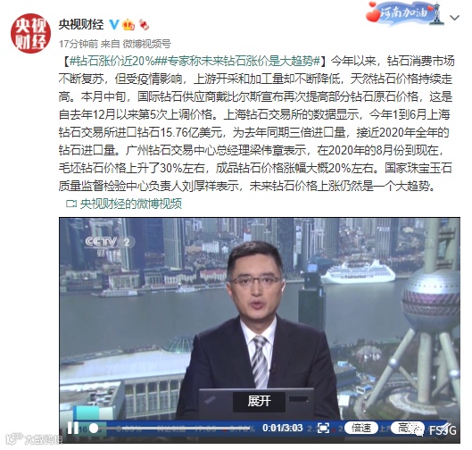 据记者了解,多家珠宝企业表示未来2~3个月钻石库存消耗完毕后,不排除涨价的可能性。