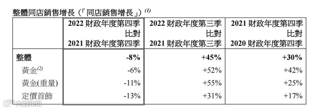 此外,六福集团2022财年第四季度业绩报告披露(截至今年3月31日止的三个月内)的同店销售同比下滑8%,黄金产品及定价首饰产品的同店销售分别同比下降6%及13%。