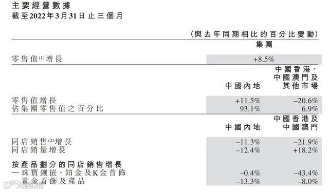 值得注意的是周大福在中国内地和中国香港、中国澳门及其他市场的同店销售均录得负增长。