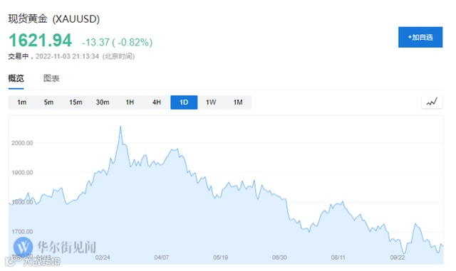 昨晚数据,现货黄金日内跌0.8%,现报1621.94美元/盎司,自三月的峰值下跌超过20%。