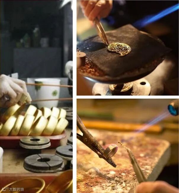 金明丰珠宝始终坚守古法金的传统加工流程,历经开料—成形(拉管)—焊接—执模—打砂(先用400目砂纸再用600目砂纸)—喷砂—铜扫—后处理等繁琐环节,生产制造出来的古法金产品在光泽、颜色等方面有足够的保证和品质。