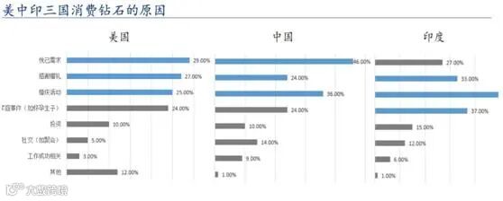 根据贝恩咨询发布的《全球钻石行业报告》统计显示,美国、中国和印度,钻石下游消费需求中占比最大的分别为悦己消费、感谢赠礼、婚庆相关活动、家庭事件(如怀孕生子)等需求,其中悦己消费在美国和中国占比排名第一,分别为29%和46%,以及感谢赠礼和家庭事件等非婚嫁需求占比也都保持较高水平,非婚嫁市场的增长将为钻石需求提供增长动力。