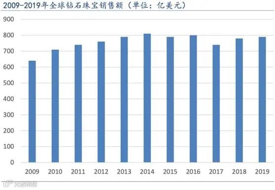 全球钻石珠宝市场规模庞大,根据戴比尔斯数据,2009年全球钻石珠宝销售额为640亿美元,2019年达到790亿美元,10年期间全球钻石珠宝销售额年均复合增长率为2.94%。