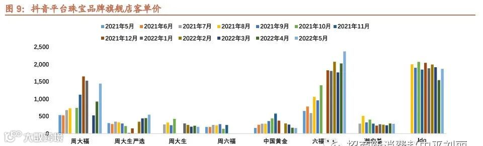 抖音方面,头部品牌GMV环比增长,旗舰店客单价、直播场次表现分化。2022年5月周大福、周大生、中国黄金、潮宏基抖音GMV分别为2928/11822/19426/5683万元,环比+87%/+38%/+31%/-19%,整体上环比维持提升态势。