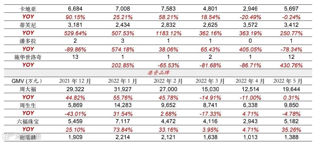 据第三方平台数据显示,22年5月淘系黄金珠宝整体GMV合计33亿元,同比下降21.07%,但环比增加10%。