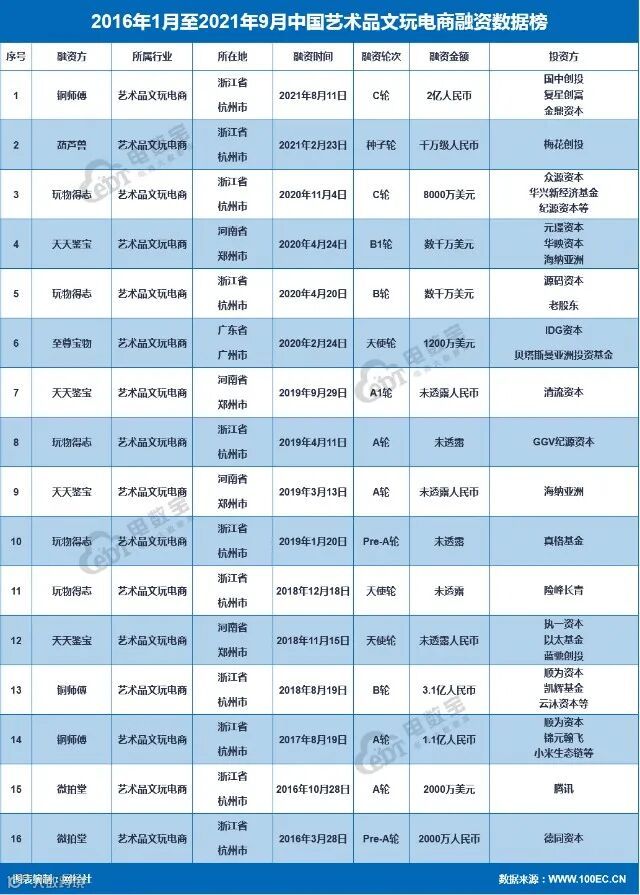 另外,根据“电数宝”电商大数据库显示,2016年1月至2021年9月,国内艺术品文玩电商领域共发生了16起投融资事件,融资金额超16.9亿元,涉及的公司包括:铜师傅、葫芦兽、玩物得志、天天鉴宝、至尊宝物、微拍堂。