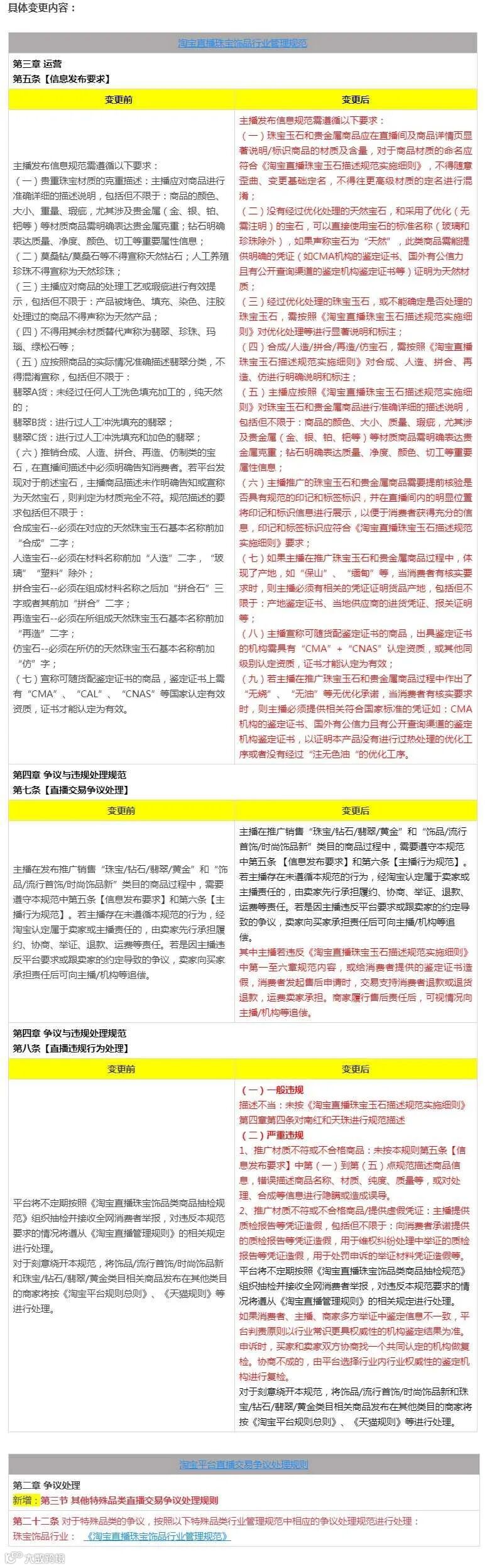 为了进一步完善对淘宝直播珠宝饰品行业的管理规范, 2月21日,淘宝网发布关于《淘宝直播珠宝饰品行业管理规范》调整及新增《淘宝直播珠宝玉石描述规范实施细则》的公示通知。