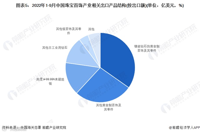 2021年,中国珠宝首饰产业出口相关产品中,主要为镶嵌钻石的黄金制首饰及其零件,以及其他黄金制首饰及其零件,两者出口额占比共计超50%。