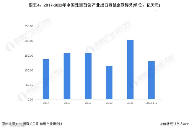2017-2021年,中国珠宝首饰产业相关产品出口金额呈波动态势,2021年,中国珠宝首饰产业相关产品出口贸易金额超200亿美元,同比增长75%以上。2022年1-9月,中国珠宝首饰产业出口贸易金额将近135亿美元。