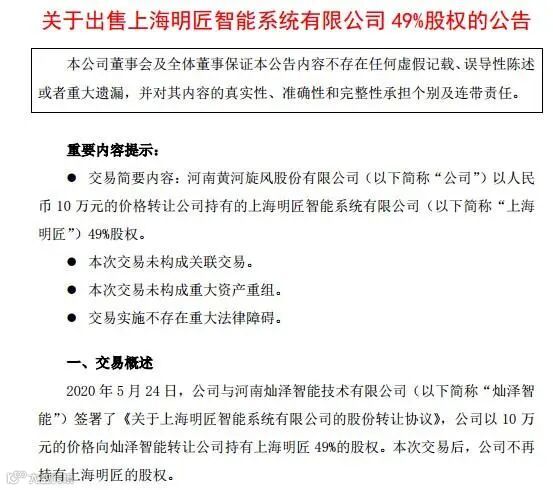 2015年5月,黄河旋风声称要多元化发展,以4.2亿元,溢价20倍,并购了一家工业智能制造公司“上海明匠”。
