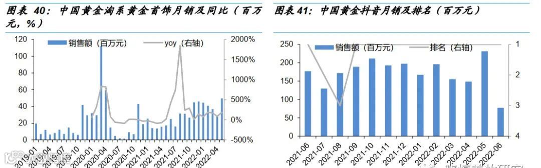 6月中国黄金淘系黄金首饰销售额0.72亿元,同增187%,延续高增;Q2累计同 增160%,较1Q22的同增130%提速。