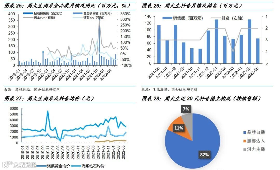 周生生抖音渠道6月排名第13、较5月下滑4位。6月销售额1176万元。抖音渠道近30天品类结构中黄金占比98.6%,抖音品类构成与淘系相似。