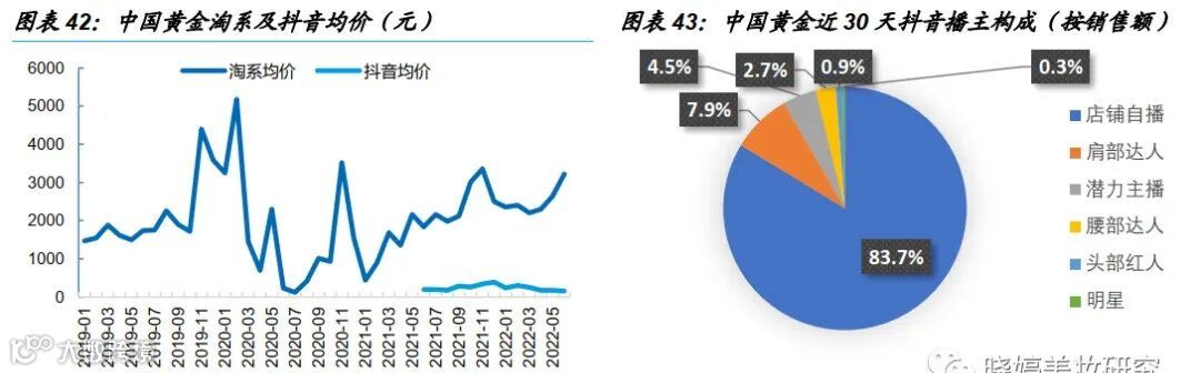 均价方面,6月淘系/抖音均价分别为1898/419元,抖音均价显著低于淘系。6月淘系黄金/钻石均价分别为1886元/2836元,黄金均价上升、钻石下降。