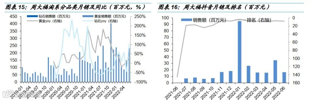 淘系分品类,黄金首饰占品牌销售的99%+、钻石体量较小。6月黄金销售额2.34亿元、同增30%、较5月增长提速;Q2累计同比+14%,较1Q22的同增23%放缓。钻石首饰5月销售额227万元,同增104%,较5月的同降44%显著改善,Q2累计同比+30%,增速与Q1持平。