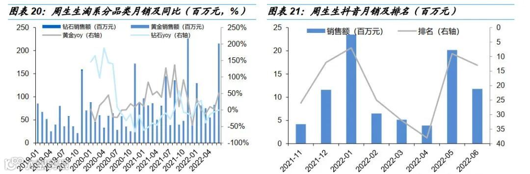 分品类,淘系以黄金为主、21年11月以来占比提升,19年1月-21年10月周大生淘系黄金销售额占比约90%,21年11月开始占比提升至95%+,与公司发力古法金产品有关。6月黄金销售额0.85亿元、同增56%,较5月的同增47%提速;Q2累计同增65%,较1Q22的同增59%略有提速。淘系钻石首饰5月销售额173万元,同降49%,4-6月降幅持续扩大;Q2累计同降41%,1Q22同增2%。